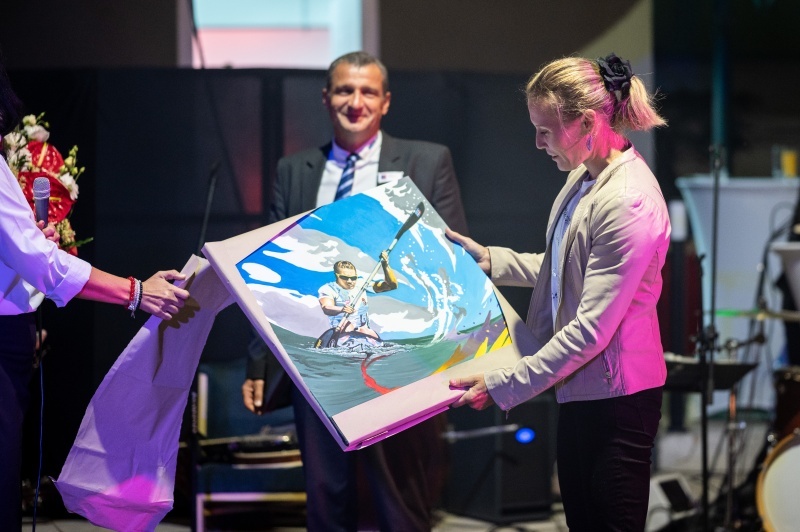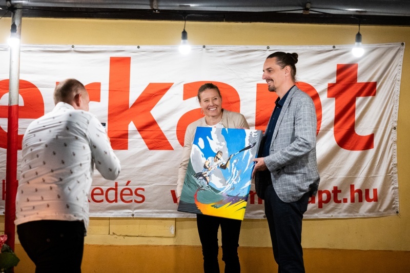 Külön öröm volt számomra, hogy személyesen is jelen lehettem a festmény átadásán, így közös fotót is készíthettünk a kajakkirálynővel.
