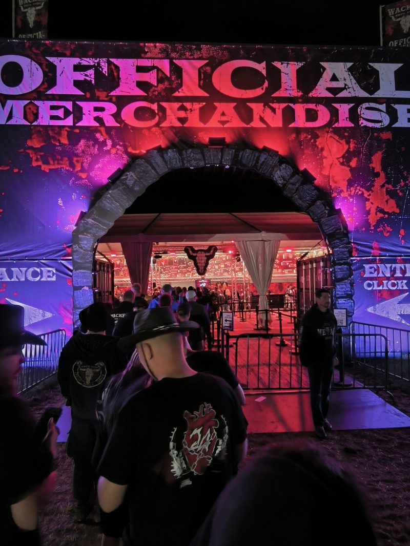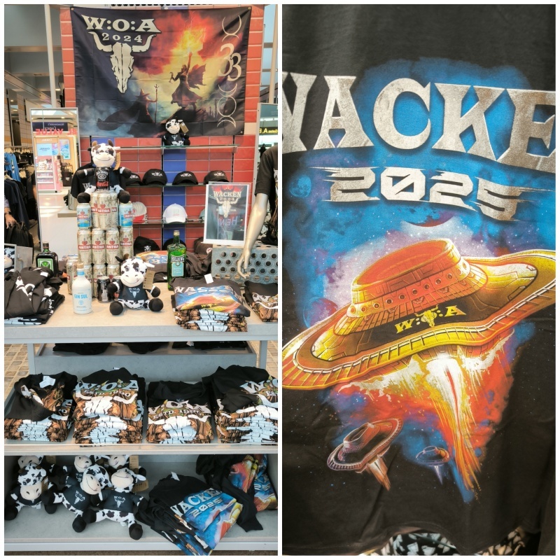 Hazafelé még benéztem a Wacken Official Merchandise szerény üzletébe, ami akkora volt mint egy cirkuszsátor és úgy tekergett benne és előtte a tömeg a nap 24 órájában, mint a reptéri csomagvizsgálatnál a legrosszabb rémálmaidban. Ha azt mondtam, hogy a zenekari shopban 200 féle motyó volt, az ide is igaz, annyi különbséggel, hogy itt csak Wacken logós cuccok voltak. Meg sem próbálom felsorolni mennyi póló, pulóver, törülköző, esőkabát, kalap, sapka, táska, kempingszék, hógömb(!), ezernyi biszem-baszom van a kínálatban, mert tényleg hajmeresztő. A legkomolyabbak több alkalommal is kiállják a sort, hogy az euro százasaikat elkölthessék. A legviccesebb, mikor már a 2024-es Wacken pólóban állsz sorba egy másik azévi Wacken pólóért.